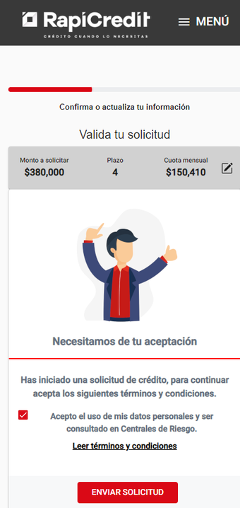 RAPICREDIT adalah platform online yang memudahkan dalam mencari pinjaman. Tidak perlu mengisi formulir apa pun dan tidak ada persyaratan fisik untuk pelamar. Setelah aplikasi dikirimkan, akan ditinjau oleh pembuat keputusan kredit dan pinjaman akan disetujui atau ditolak.